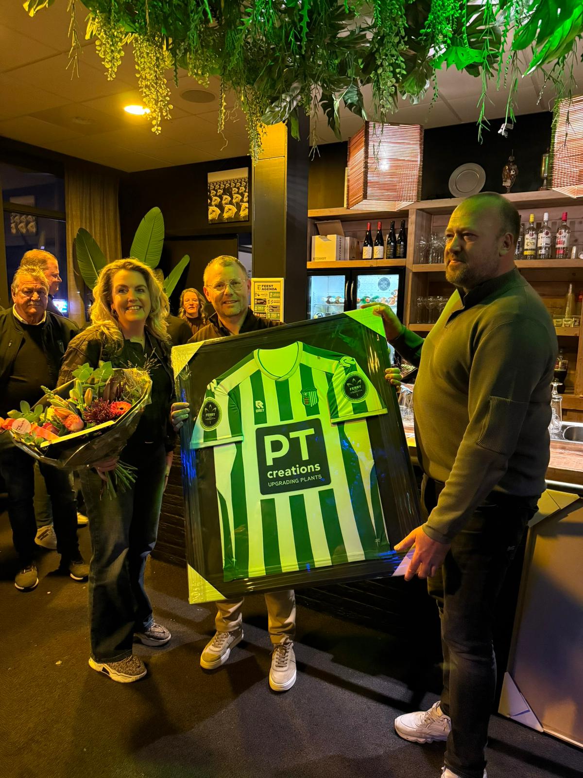 Voorzitter Henk van Achilles Veen en Peter Schoon, voorzitter van de sponsorcommissie, spraken mooie woorden van dank uit. Als blijk van waardering ontvingen beide sponsoren een ingelijst wedstrijdshirt, een kleurrijke bos bloemen en een ontspannende tegoedbon.